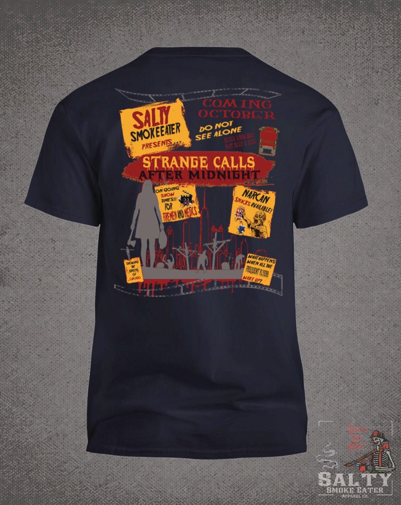 Strange Calls After Midnight shirt celebrates the eerie and unpredictable nature of the fire service. Featuring a spooky nighttime city skyline, ghostly figures, and eerie warnings like "Do Not See Alone," this shirt captures the strange and sometimes supernatural experiences firefighters face on late-night calls. With references to firehouse life and emergency calls, it's perfect for Halloween or any fan of dark humor.