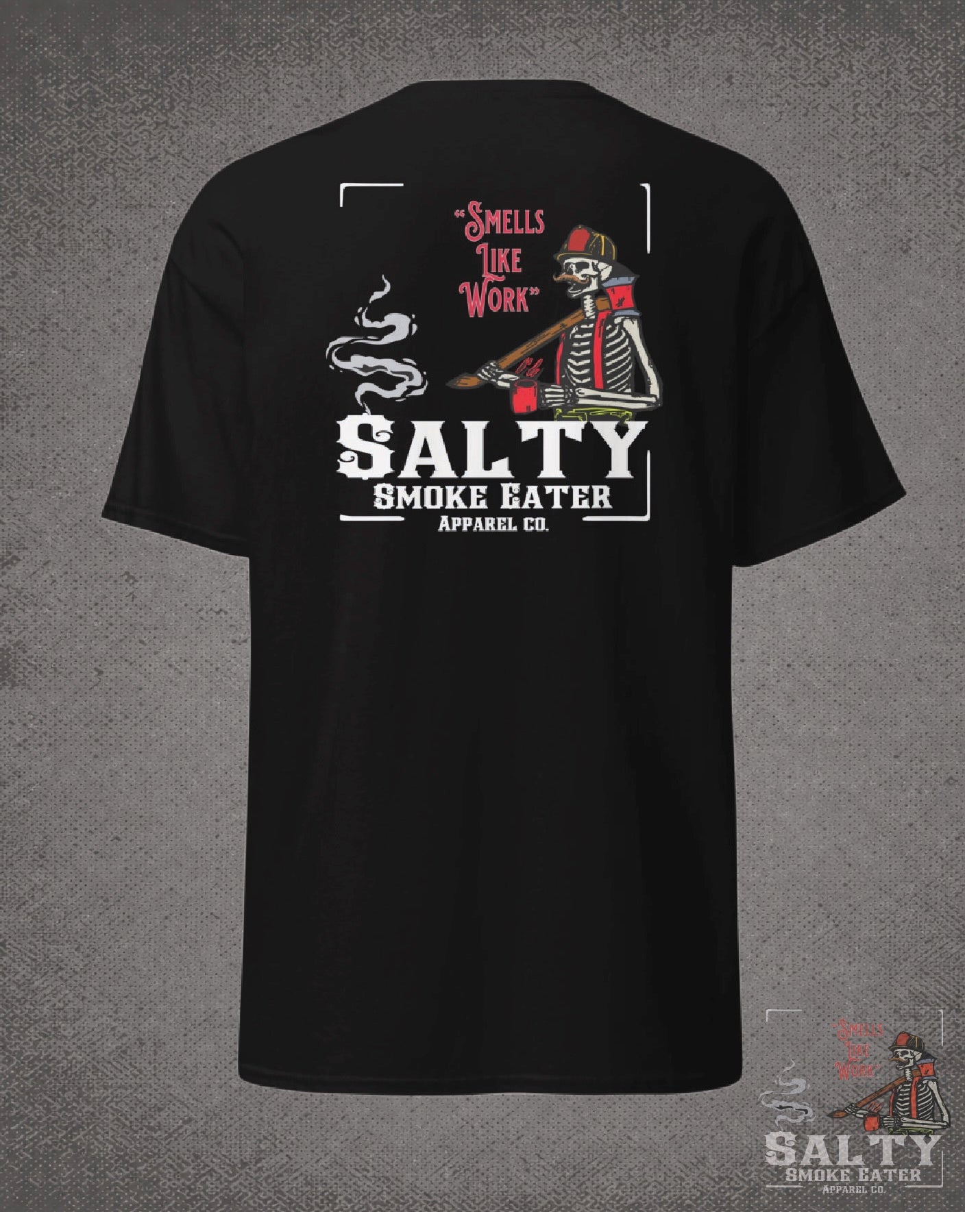 - Text: The phrase “Smells Like Work” is displayed at the top in a bold, vintage-style font, capturing the attitude of those who don’t shy away from the hard, smoky realities of the job. Below the image, our company name “Salty Smoke Eater Apparel Co.” is printed in rugged white lettering, giving the design a classic, no-nonsense look.